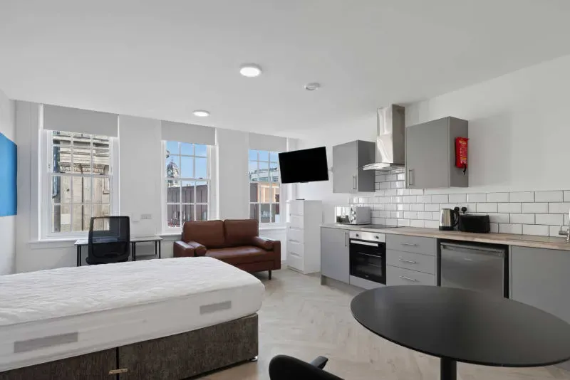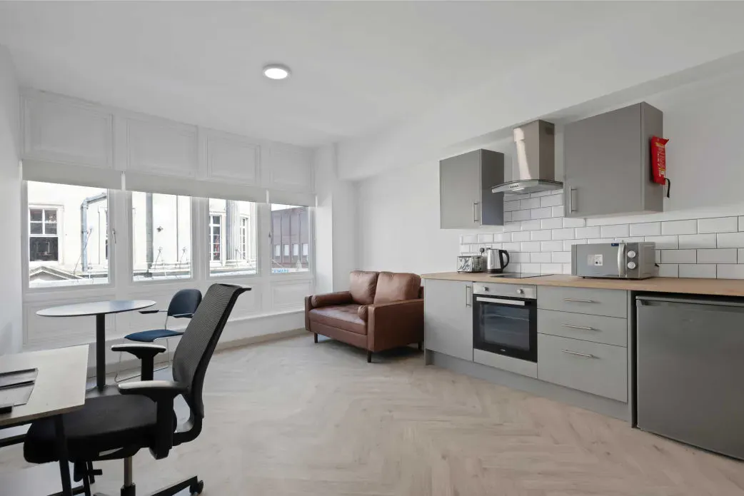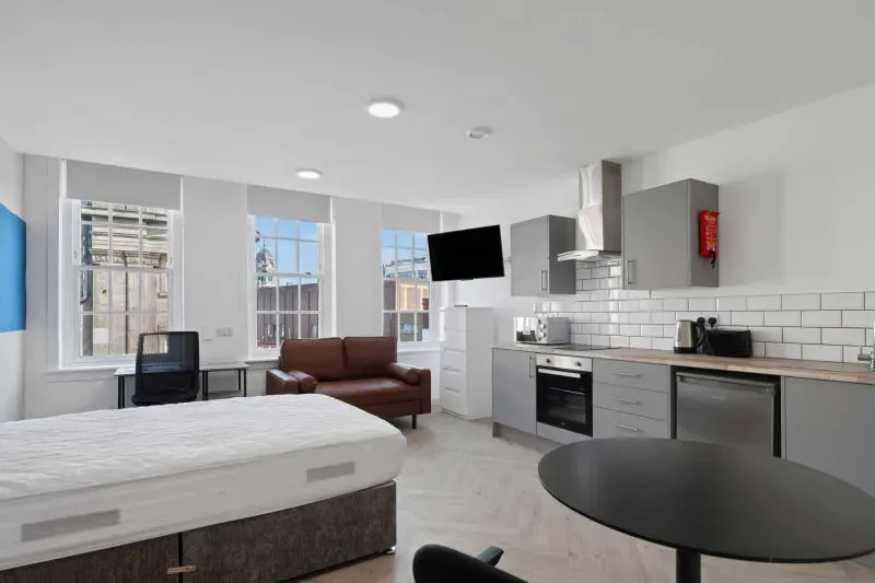 Rooms are fully furnished with a double bed, storage, wardrobe and study space. Kitchens include a 4-ring induction hob, oven and fridge with icebox. Studios also include a 43-inch Smart TV. You will need to bring your own bedding and kitchen utensils.